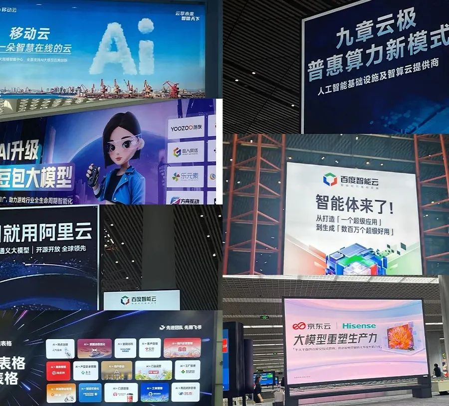 7月,我们在首都机场T3逛了一圈,值机大厅挤满了中国移动、联通、阿里云、百度云、京东云、联想、第四范式、九章云极的AI广告。厂商们不是卖一体机就是卖大模型、智能体,还有智驾等等AI解决方案。