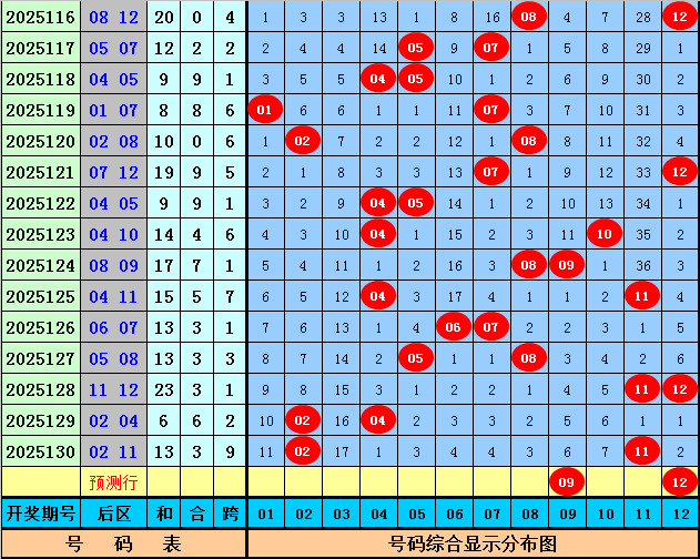 后区奖号分析:上期后区开出奖号02+11,奖号和值为13,跨度为9,本期后区注意和值走大,参考两码09 12。