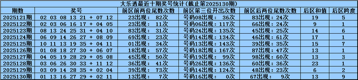 体彩大乐透第2025130期奖号为:01 13 16 27 29+02 11,前区号码大小比开出2:3,012路比开出1:3:1,奇偶比开出4:1,后区号码和值开出13,跨度开出9。